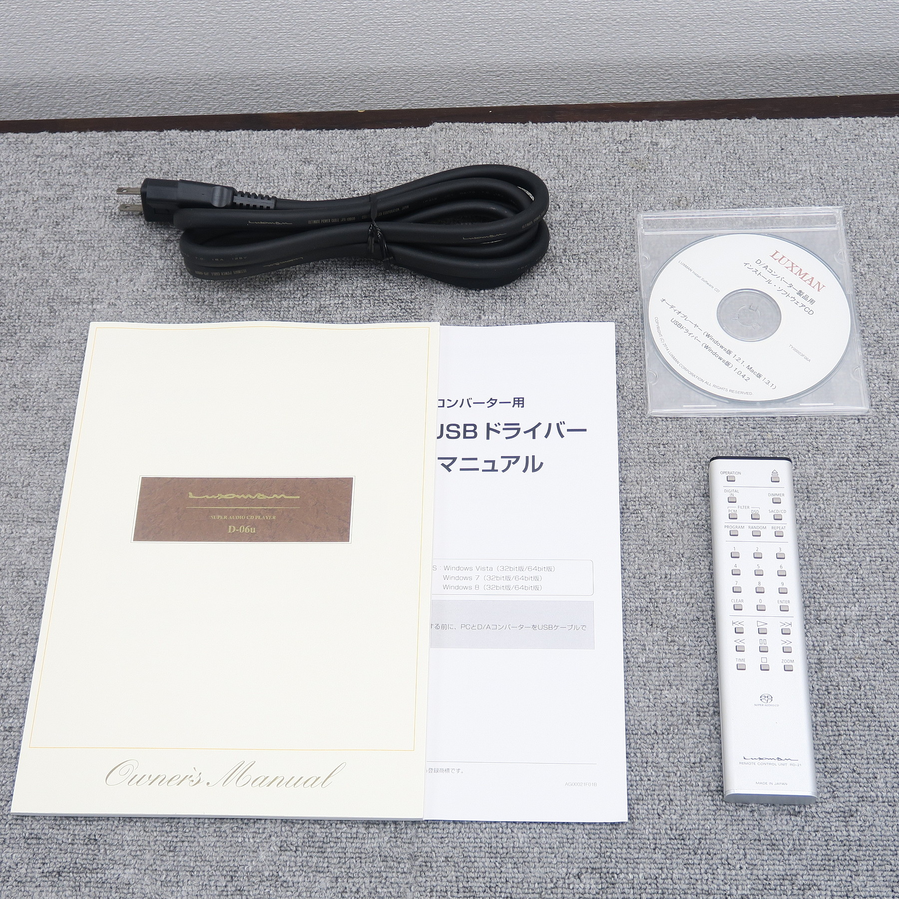商品は本体、リモコン、電源ケーブル、取扱説明書、ドライバインストールCD、元箱です。