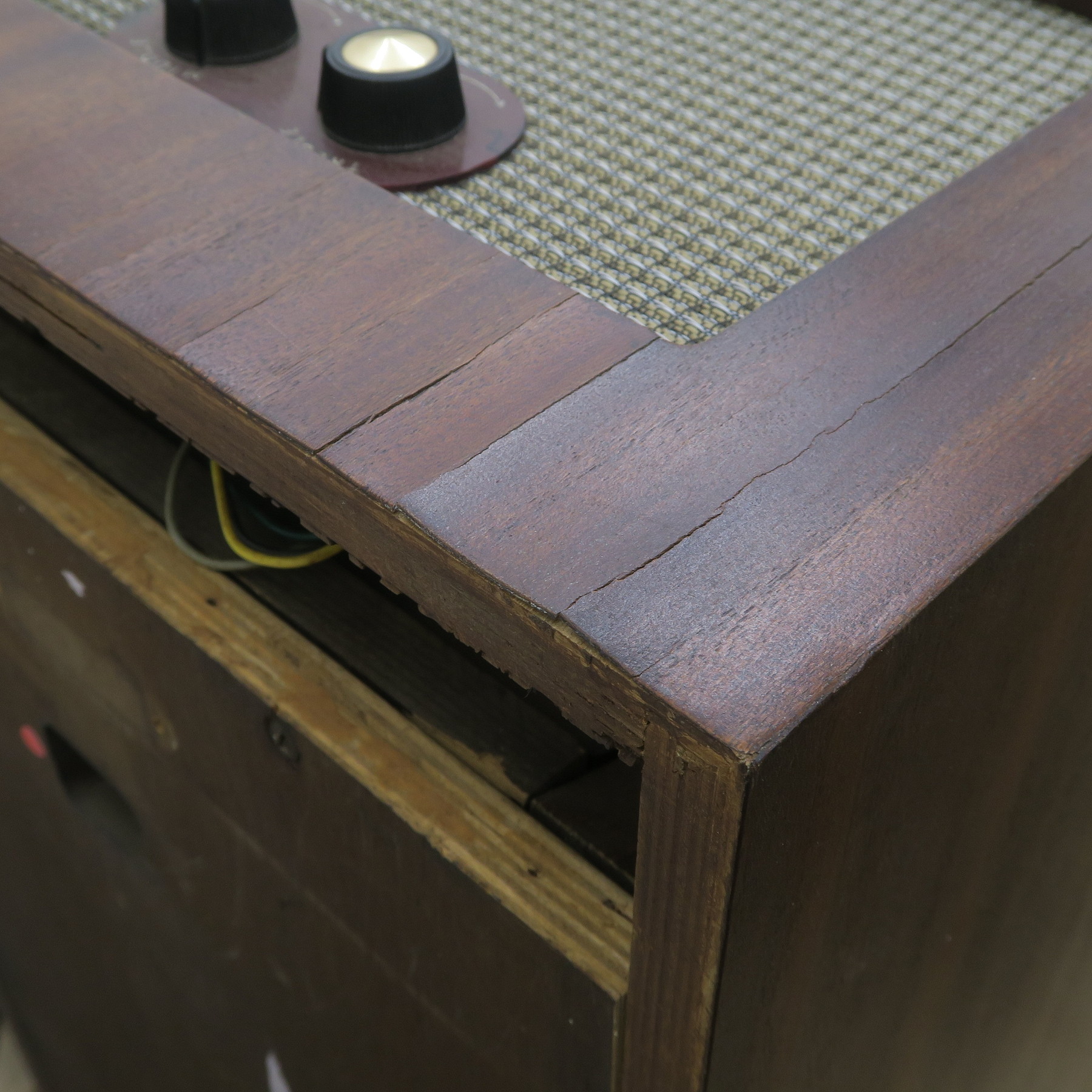 天板を中心に板に浮きやひび割れが多数みられます。