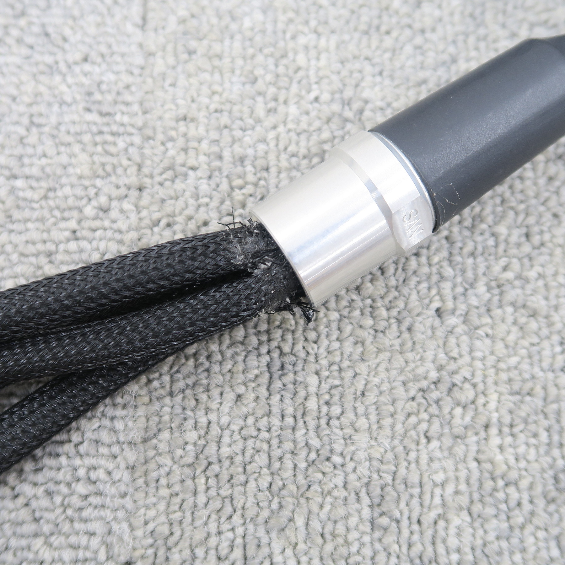配線が4本に分離する箇所の根本にほつれがあり、中の配線の被膜が見える状態です。