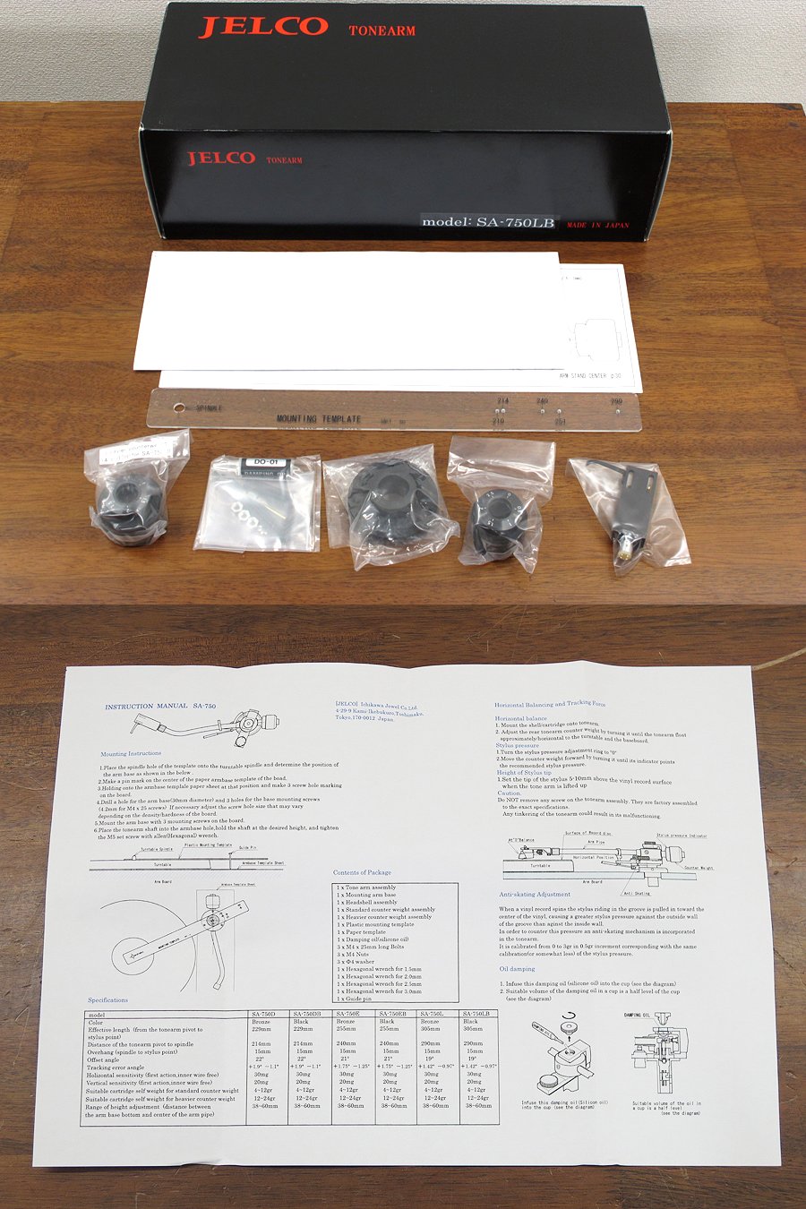 商品は本体、ヘッドシェル、錘、取扱説明書(英語)、元箱です。